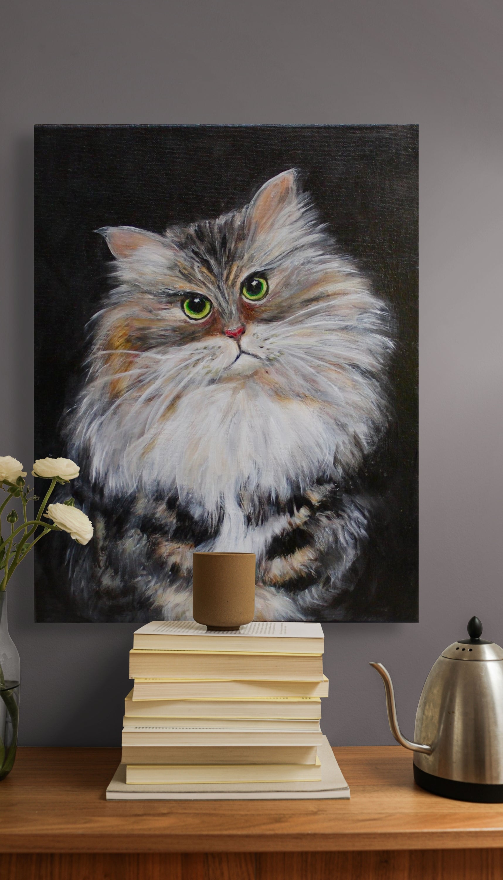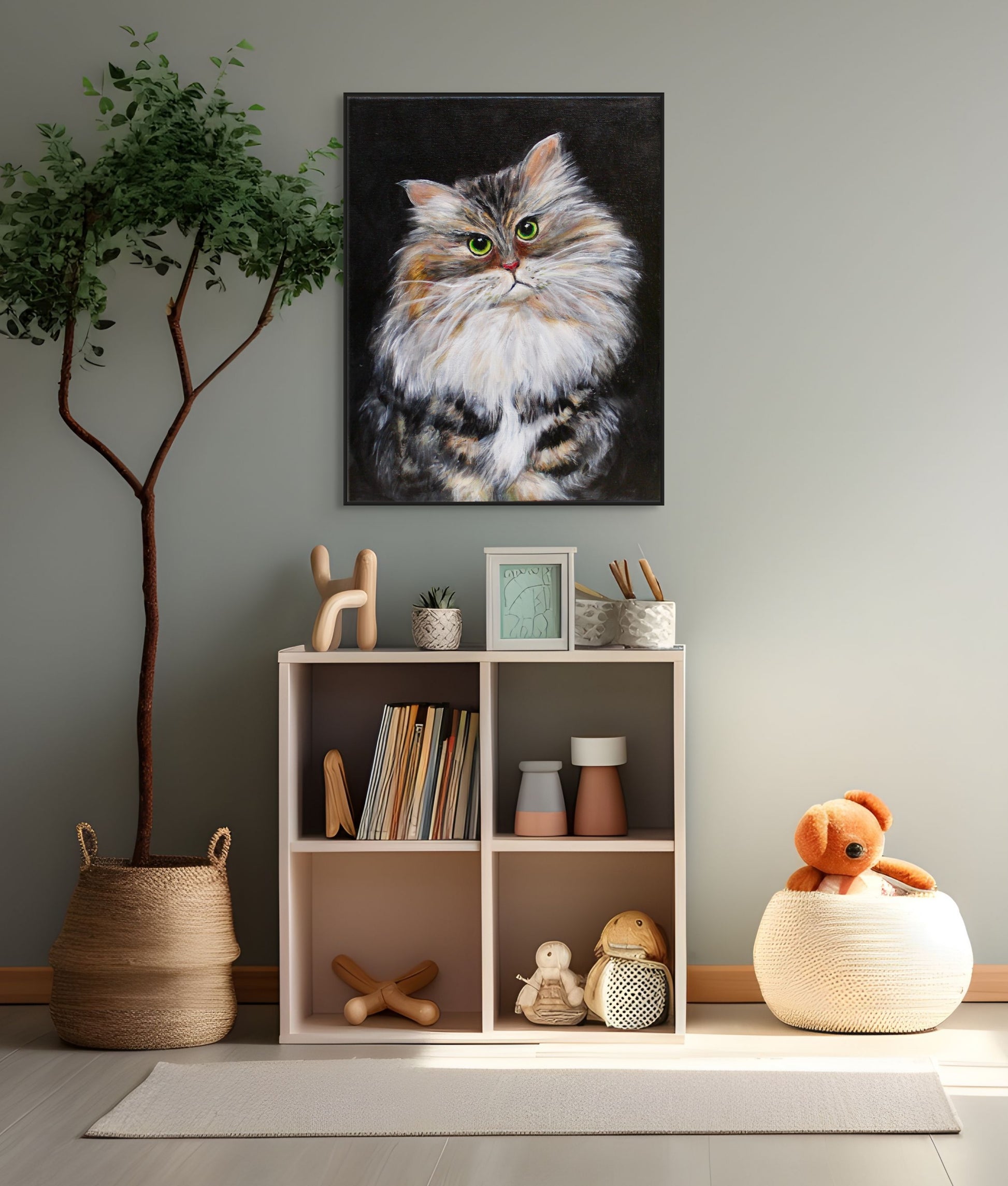 Cuddly with an attitude. This cat will add some fun to any room. Acrylic 11X14 on canvas.