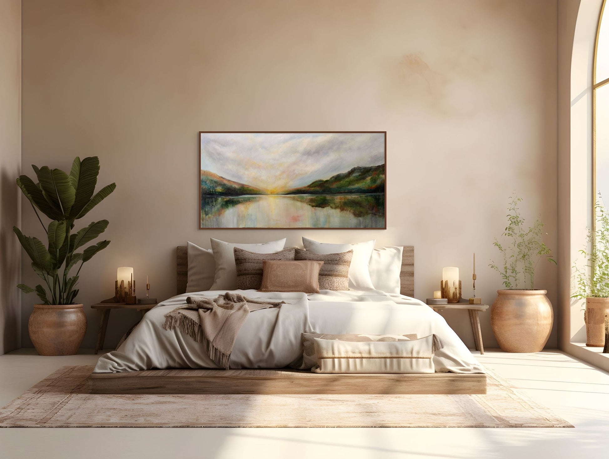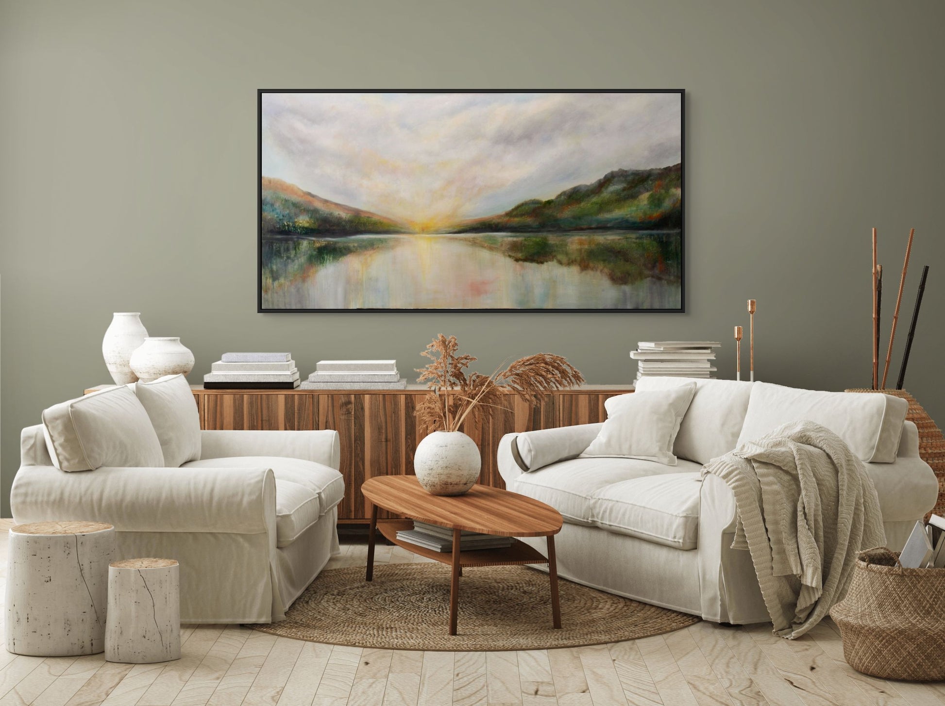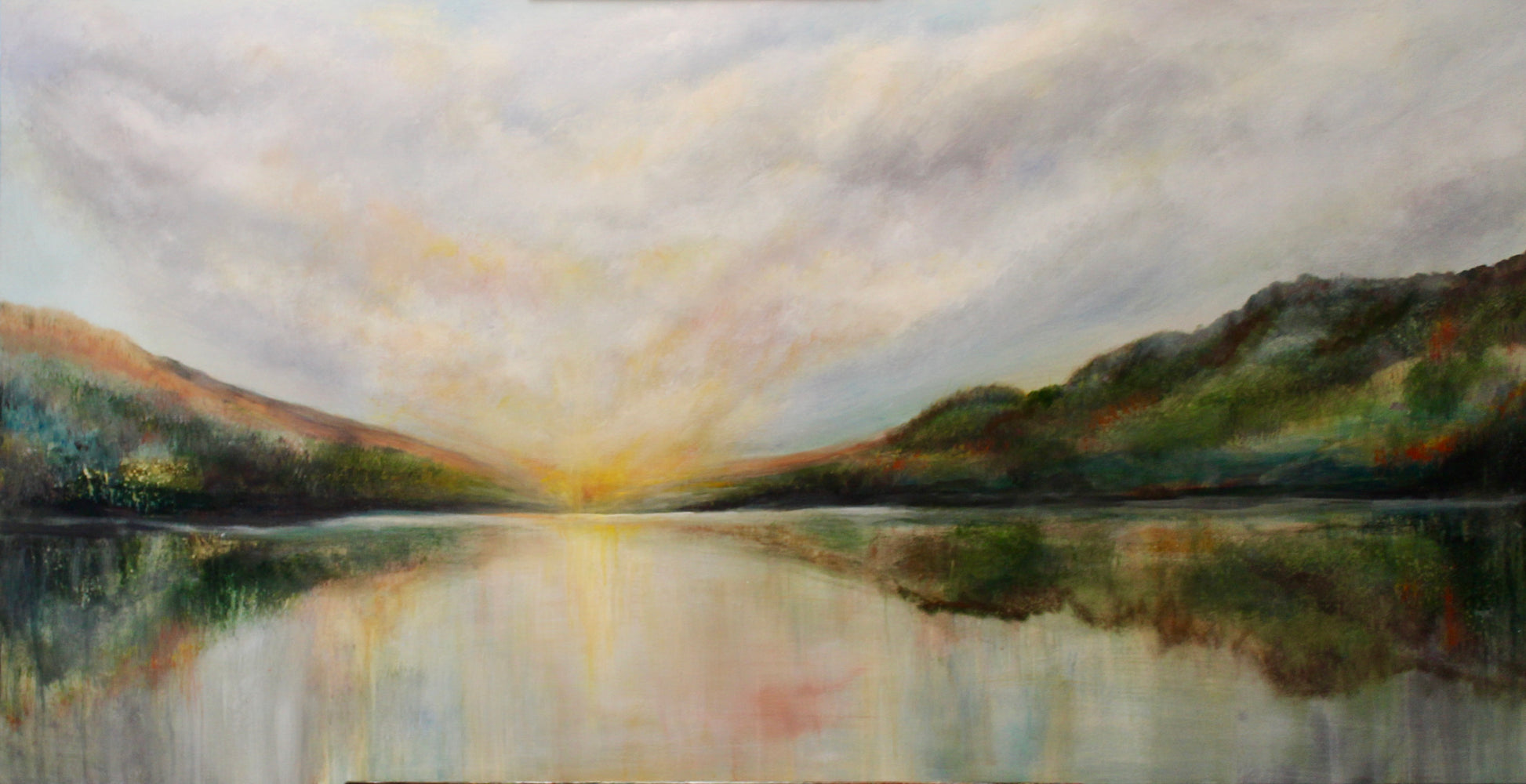 This painting is full of light and expectation of a renewal of light. Peace and reflection come from the passing of a the day. Acrylic,24X48 on 2 inch gallery wrapped canvas.